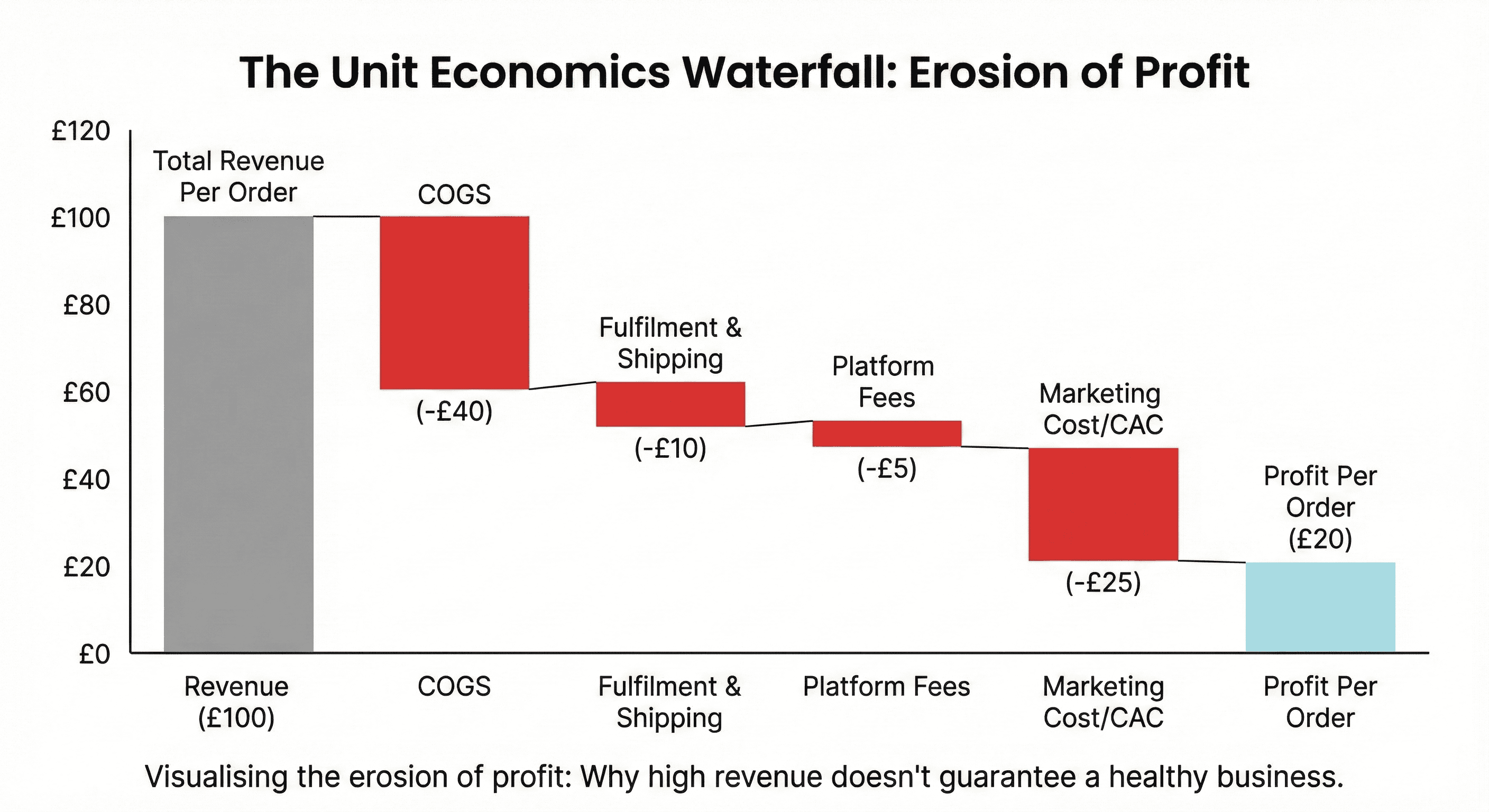 Profit per order = Revenue − (COGS + Fulfillment + Fees + Attributed Marketing Cost)