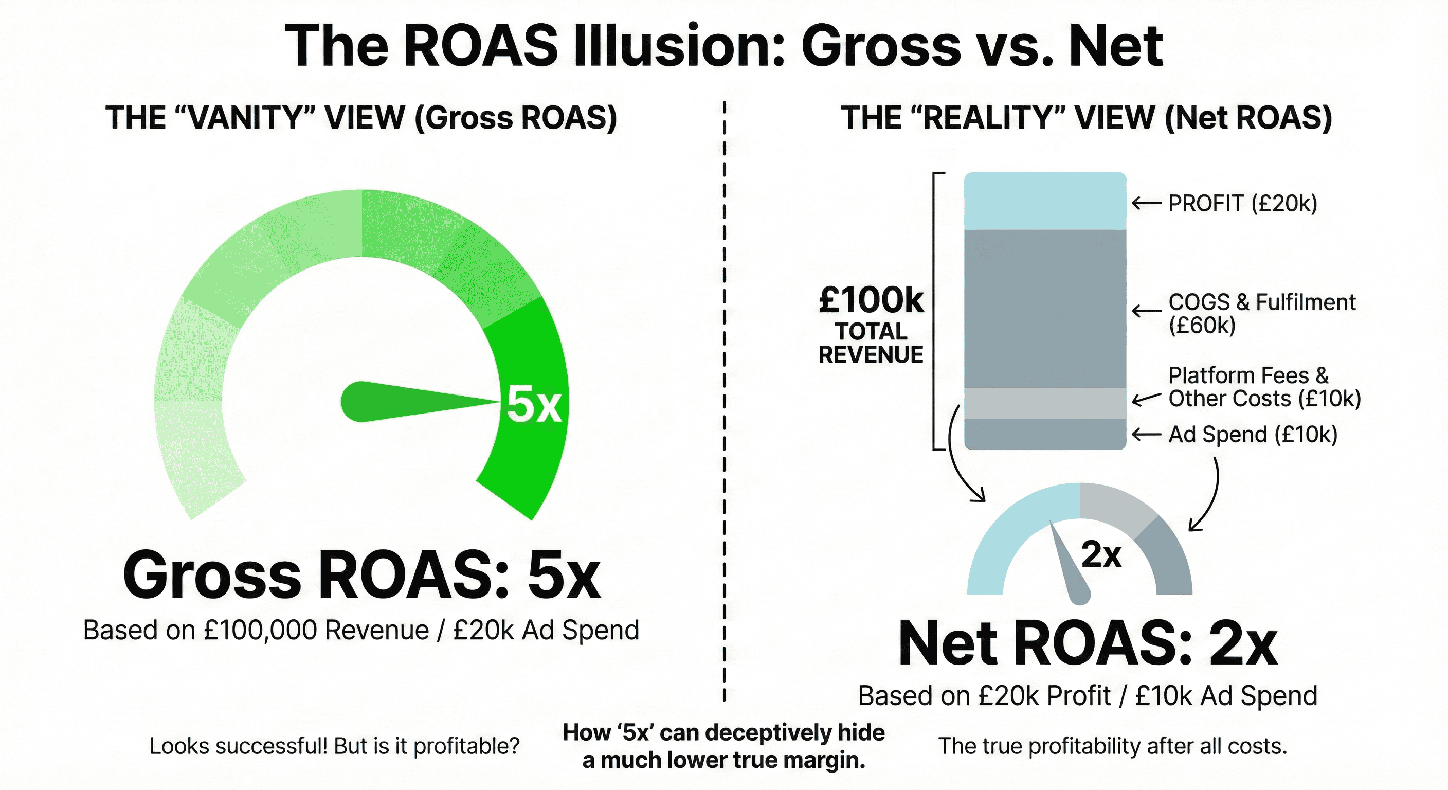 Gross ROAS can be high even if margins are razor‑thin. Net ROAS reveals the truth.
