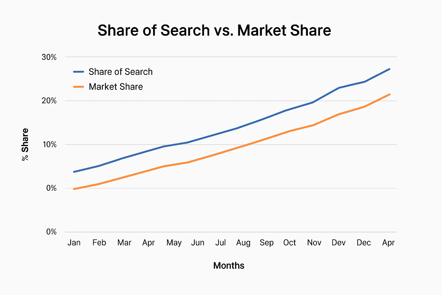 Share of Search measures the proportion of branded searches for your company versus competitors. It’s a direct indicator of brand demand.